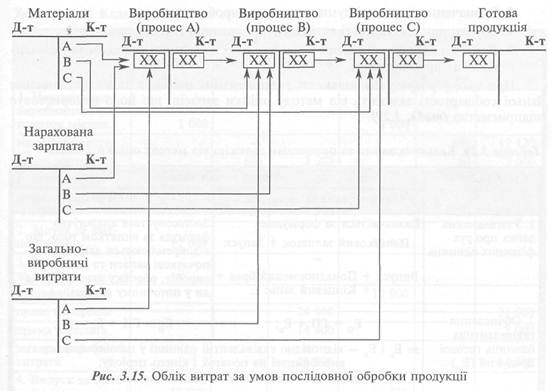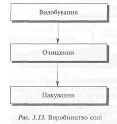 Залишок незавершеного виробництва визначається інвентаризацією або за даними оперативного обліку і оцінюється за плановою (нормативною) собівартістю або за собівартістю еквівалентної одиниці продукції. Найскладнішим є калькулювання за умов, коли технологічний процес виробництва остаточної продукції складається з окремих стадій обробки, що можуть здійснюватися послідовно або паралельно. Прикладом послідовної обробки є виробництво солі (рис. 3.13), а паралельної — виробництво взуття (рис. 3.14).