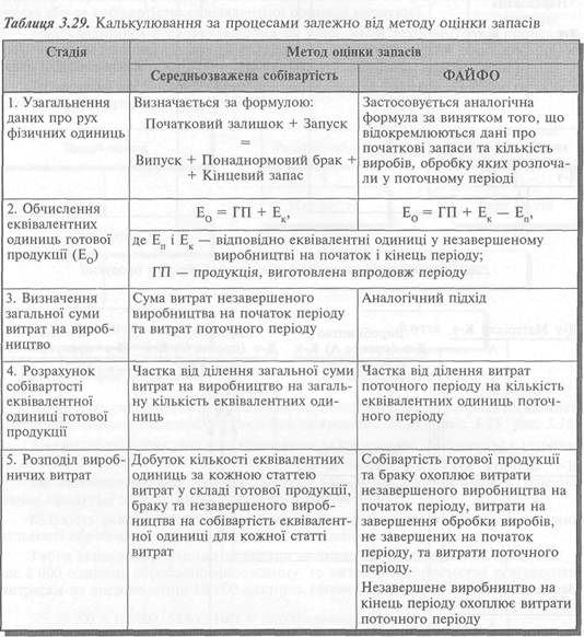 3. Визначення загальної суми витрат на виробництво. 4. Розрахунок собівартості еквівалентної одиниці готової продукції. 5. Розподіл виробничих витрат між готовою продукцією, браком та незавершеним виробництвом. При цьому розрахунок кількості еквівалентних одиниць та калькулювання їхньої собівартості залежить від методу оцінки запасів, що його використовує підприємство (табл. 3.29).