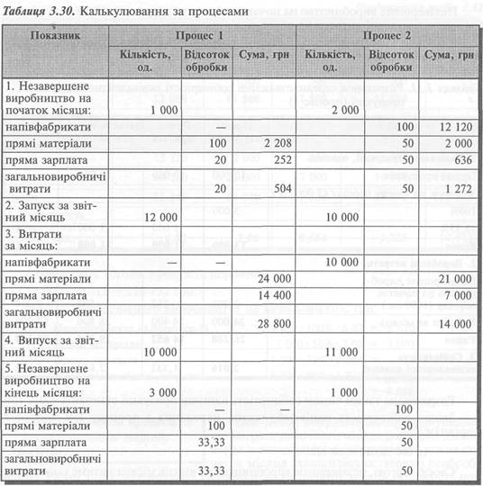 Розрахована таким чином собівартість одиниці продукції становить 6,012 грн. Звідси собівартість напівфабрикатів, переданих з процесу 1 у процес 2, дорівнює: 10 000-6,012 = 60 120. Своєю чергою, незавершене виробництво на кінець місяця матиме таку оцінку: Прямі матеріали 3 000 • 100% • 2,016 = 6 048 Пряма зарплата 3 000 • 33,33% ■ 1,332 = 1 332 Загальновиробничі витрати 3 000 • 33,33% • 2,664 = 2 664