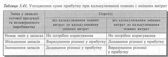 Отже, внаслідок збільшення запасів готової продукції (за відсутності зміни залишків незавершеного виробництва) прибуток за системою калькулювання повних виробничих витрат перевищує прибуток за системою калькулювання змінних витрат на 220 000 грн. Така різниця залежно від характеру змін у запасах відповідно додається або віднімається від суми прибутку при переході від однієї системи калькулювання до іншої (табл. 3.41).