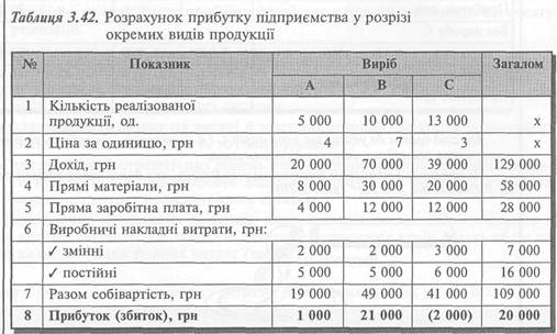 Підприємство виготовляє три види продукції А, В і С і має такий результат діяльності за звітний період (табл. 3.42):