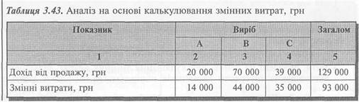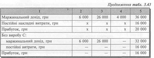 Наведений розрахунок було зроблено шляхом калькулювання повних витрат. Він показує, що виріб С є збитковим. Отже, керівництво підприємства може розглядати питання про припинення виробництва виробу С. На думку керівництва, це дасть змогу уникнути збитку 2 000 грн, тобто збільшить прибуток на цю суму. Але спробуємо подивитися на цю ситуацію під кутом зору калькулювання змінних витрат. Для цього перетворимо дані табл. 3.42 на Звіт про прибуток, що містить показник маржинального доходу (табл. 3.43). Аналіз ситуації на основі калькулювання змінних витрат свідчить, що в разі припинення виробництва виробу С підприємство втратить маржинальний дохід на суму 4 000 грн, що, відповідно, призведе до зменшення прибутку на цю суму. На перший погляд, маємо парадоксальний висновок: зняття з виробництва збиткового виробу зменшує прибуток підприємства.