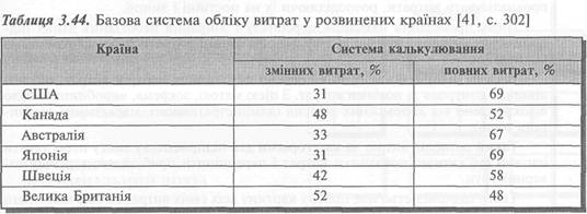 Ця система калькулювання має як прибічників, так і критиків, оскільки в неї є і переваги, і вади. Перевагами системи калькулювання змінних витрат є: • звіти, складені на основі калькулювання змінних витрат, більшою мірою відповідають інтересам керівників підприємства, оскільки дають змогу приймати поточні рішення і здійснювати оцінку окремих сегментів діяльності (підрозділів, регіонів, категорій замовників тощо); • спрощується калькулювання собівартості продукції, а оцінка запасів здійснюється відповідно до поточних витрат, необхідних для виготовлення певних виробів; • величина операційного прибутку перебуває у прямій залежності від обсягу реалізації. Вадами системи калькулювання змінних витрат вважають: • звітність підприємства, складена на основі калькулювання змінних витрат, не відповідає загальноприйнятим принципам підготовки фінансової звітності та вимогам податкової системи; • для розподілу витрат на змінні й постійні потрібні додаткові розрахунки, які не завжди забезпечують точний результат; • для прийняття стратегічних рішень необхідна інформація про повні витрати підприємства, що потребує додаткових витрат на розподіл постійних накладних витрат позасистемним шляхом. Узагальнення досліджень практики використання систем калькулювання в різних країнах свідчить, що компанії багатьох розвинених країн ведуть облік на основі калькулювання повних витрат (табл. 3.44).