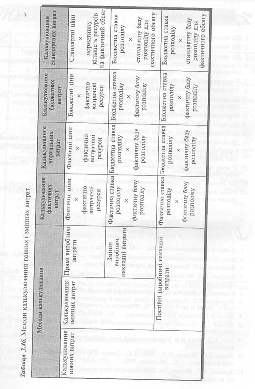 Подальшим розвитком калькулювання змінних витрат є калькулювання продуктивності. Метою такої моделі є відображення продуктивного маржинального доходу, що визначається різницею між доходом від продажу та прямими матеріалами. Детальніше таку модель калькулювання розглянуто у розділі 9. Слід відзначити, що калькулювання змінних і повних витрат можуть мати різні модифікації залежно від оцінки статей витрат. Зокрема, в основу оцінки усіх або окремих статей витрат, що включаються до собівартості продукції (робіт, послуг), можуть бути покладені фактичні бюджетні або стандартні витрати (табл. 3.46). В Україні для ведення бухгалтерського обліку й складання зовнішньої фінансової звітності Положенням (стандартом) бухгалтерського обліку 16 "Витрати" передбачено комбінацію повного калькулювання фактичних змінних витрат і нормальних постійних витрат. Це зумовлено тим, що для розподілу постійних за-гальновиробничих витрат використовують нормальну потужність, а інші виробничі витрати включають до собівартості виробленої продукції (робіт, послуг) у сумі фактичних витрат.