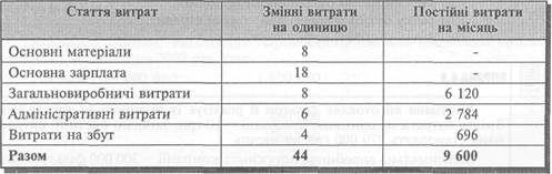 Необхідно: 1) визначити точку беззбитковості й побудувати графік беззбитковості; 2) визначити, який прибуток матиме підприємство у разі продажу 1 000 одиниць продукції; 3) визначити, який обсяг продажу необхідний для одержання прибутку 70 400 грн. ВПРАВА 4.5 e Фірма "Бон" має коефіцієнт маржинального доходу 40% і повинна реалізувати ЗО 000 одиниць продукції за ціною 50 грн, щоб бути беззбитковою. Необхідно обчислити: а) загальні постійні витрати; б) змінні витрати на одиницю. AT "Кумач" має постійні витрати у сумі ПО 000 грн, змінні витрати на одиницю 4 грн, коефіцієнт маржинального доходу 20%. Необхідно визначити: а) ціну продукції підприємства та маржинальний дохід на одиницю; б) обсяг продажу, необхідний для отримання операційного прибутку 50 000 грн.