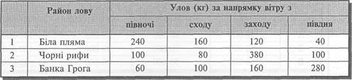 У звичайний день цієї пори року вітер дме з півночі 30% часу, зі сходу — 10%, із заходу - 40%, з півдня — 20%. Необхідно: 1. Без додаткової інформації розрахувати очікуваний улов у кожному районі й дати капітанові рекомендацію. 2. Припустімо, що капітан має змогу отримати точний метеопрогноз про напрямок вітру. Якщо ціна реалізації кети 50 грн за кілограм, то яку максимальну суму можна заплатити за точний прогноз погоди?