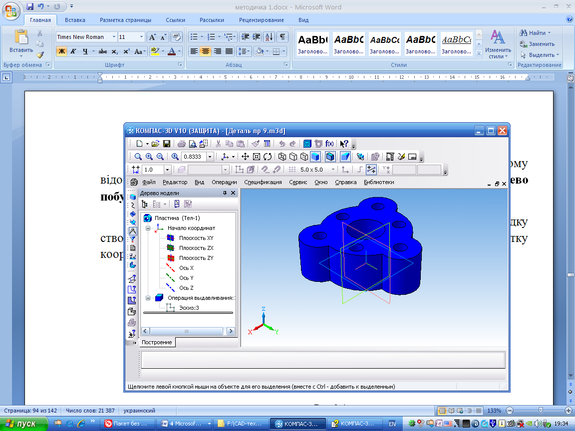 Рис. 9.3 При роботі з будь-якою деталлю на екрані, крім вікна, в якому відображається модель, знаходиться вікно (рис.9.4), що містить Дерево моделі. В дереві моделі вказується послідовність створення моделі, в порядку створення відображаються всі використані об'єкти (позначення початку координат, площини, осі, ескізи, операції).