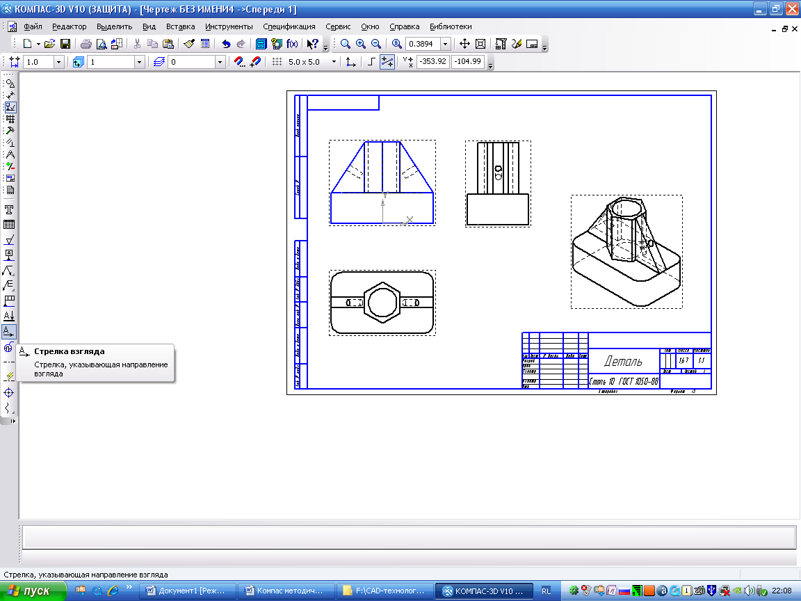 Елементи деталей, розташовані на похилих площинах, при побудові основних виглядів спотворюються. Наприклад, циліндричні отвори на ребрах жорсткості у деталі «Опора» на вигляді зверху і зліва спотворюються – замість кіл бачимо еліпси. Задати діаметри цих отворів на таких виглядах складно. Щоб уникнути спотворень, будують додатковий вигляд за перпендикулярним до похилої площини напрямом огляду (показаний на кресленні стрілкою). Для побудови додаткового вигляду потрібно виконати наступні дії: 1. Зробити робочим вигляд спереду. 2. Вибрати напрям огляду за допомогою послуги Стрілка огляду 3. Побудувати асоціативний вигляд за стрілкою можна звернувшись до послуги Вигляд за стрілкою