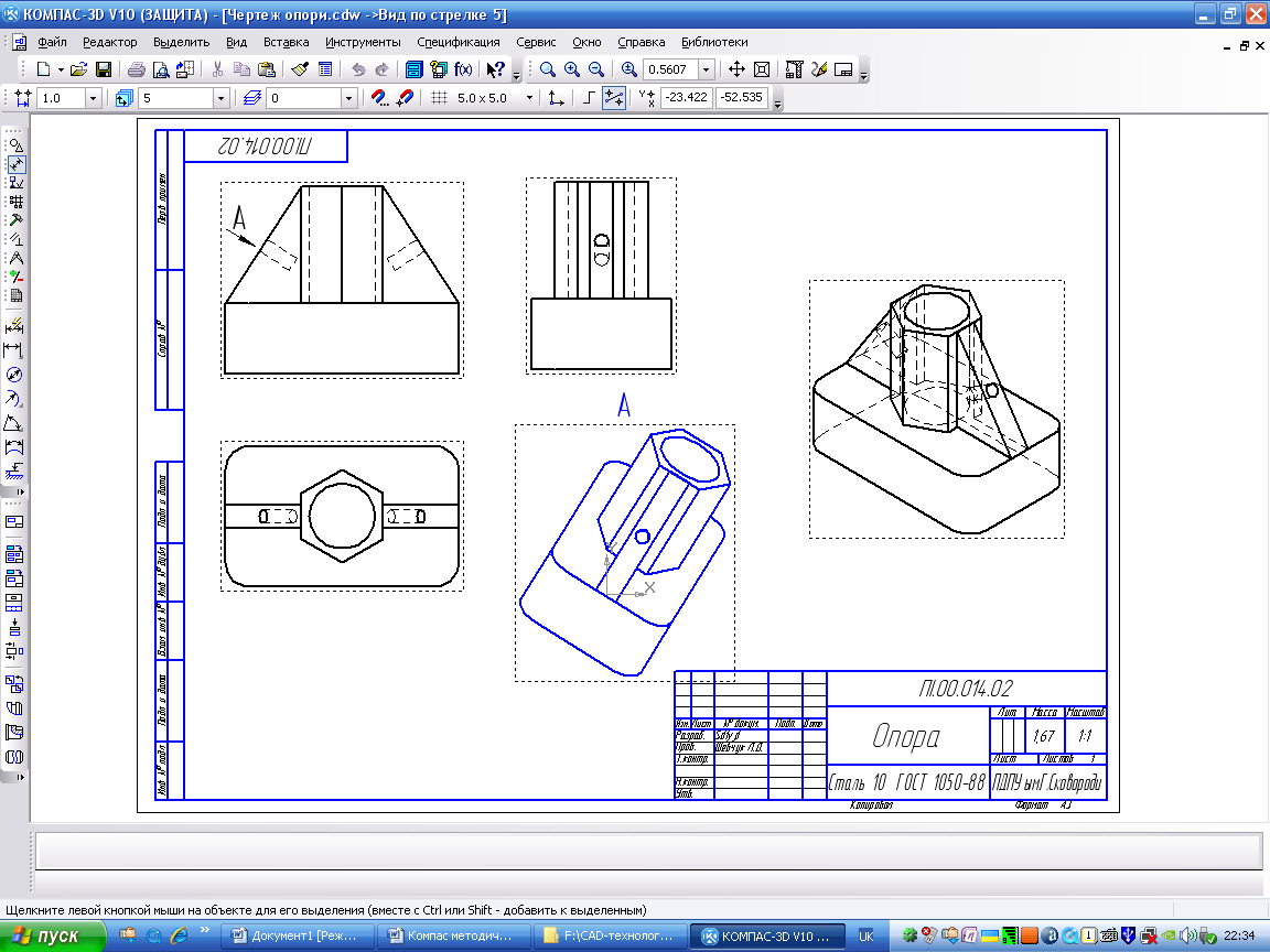 Створення асоціативних виглядів деталі. Прийоми побудови основних асоціативних виглядів (спереду, зверху, зліва і ізометрії) розглянуті в лабораторній роботі №.13 Побудуємо перераховані асоціативні вигляди деталі «Опора». Зазначимо, що робочим, тобто доступним для редагування (зміни) може бути тільки один з виглядів креслення. У полі Поточний вигляд відображається номер або ім'я (це залежить від налаштувань, зроблених в діалозі параметрів виглядів) поточного вигляду. Щоб зробити поточним інший вигляд, потрібно ввести або вибрати із списку потрібний номер (ім'я). Розглянемо прийоми редагування побудованих виглядів. Переміщення виглядів з руйнуванням проекційних зв'язків розглянуте в попередній лабораторній роботі.