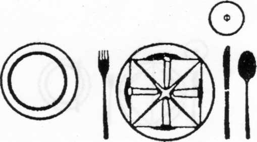 1 — підставна тарілка або декоративний піднос; 2 — закусочна або основна тарілка; 3 — пиріжкова тарілка; 4 — столовий ніж; 5 — рибний ніж; 6 — закусочний ніж; 7 — столова виделка; 8 — рибна виделка; 9 — закусочна виделка; 10 — десертна виделка; 11 — десертна ложка; 12 — столова або бульйонна ложки; 13 — ніж для масла; 14 — додаткова пара закусочних приладів; 15 — фужер для води; 16 — бокал для шампанського; 17 — бокал для червоного вина; 18 — бокал для білого вина; 19 — горілчана чарка; 20 — полотняна серветка. Як це роблять французи. Один з варіантів (Рис17.):