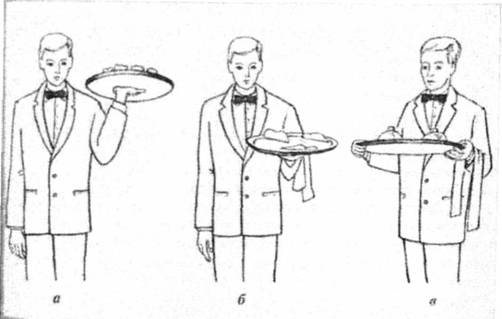 Рис.8.1. Техніка перенесення офіціантом підноса: а - на рівні плеча; б - на рівні зігнутого ліктя; в - на рівні грудей