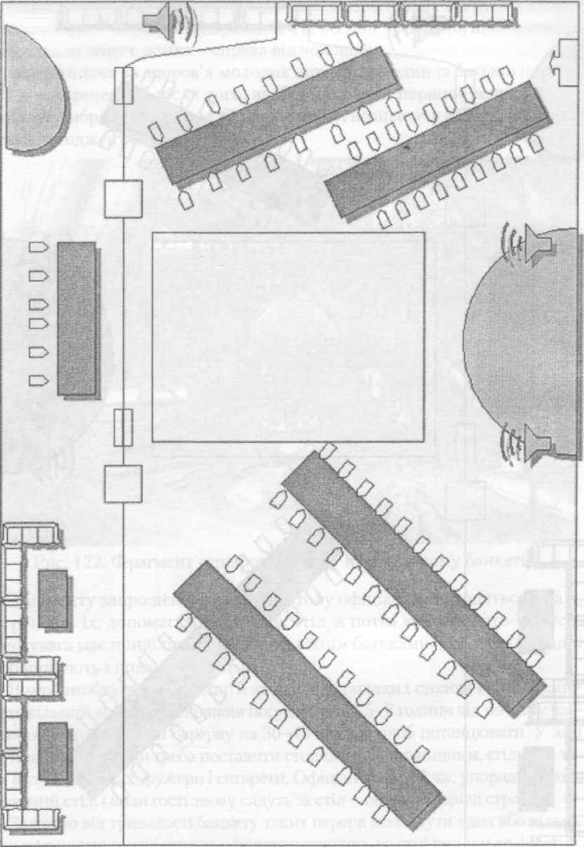 Проведення кожного святкового вечора підпорядковується певній темі, відповідно до якої оформляють зал, розробляють меню, сервірують стіл, складають музичну програму. Ресторан має заздалегідь рекламувати заходи, присвячені знаменним датам або професійним святам, давати рекламні оголошення в газетах, по радіо, телебаченню про порядок проведення заходів, придбання квитків, вартість святкової вечері. У процесі підготовки складають схему розміщення столів та розробляють меню. При продажу запрошень клієнтів ознайомлюють з меню і планом залу. У запрошенні вказується назва ресторану, адреса, дата і час збору гостей, номер столика та програма торжества. Меню вкладається у запрошення. Для обслуговування весільних торжеств у ресторані виділяють спеціальні приміщення. Краще, якщо їх два: одне - для зустрічі, збору гостей і танців, друге - для бенкетного столу. За наявності тільки одного залу бенкетний стіл ставлять так, щоб біля вхідних дверей залу залишалося місце для зустрічі гостей та для танців. Для весільних бенкетів рекомендується мати спеціально оформлені обкладинки для меню, в які вкладають меню, надруковане на бланку, без зазначення вартості страв і напоїв. Порядок оформлення замовлення на весільний бенкет такий самий, як і на інші заходи. Додатково із замовником з'ясовують: • особливості обслуговування з урахуванням національних традицій; • де виділити місце для подарунків; • час подачі гарячих страв і перерв; • чи потрібно окремо організовувати чайний стіл та ін. Щоб весілля пройшло весело, з дотриманням прийнятих звичаїв та ритуалів, необхідно заздалегідь скласти план організації обслуговування. Але при оформленні замовлення на організацію такого бенкету в меню варто рекомендувати закуски, напої, страви, кондитерські вироби та фрукти в дещо більшій кількості й асортименті, тому що, на відміну від інших бенкетів, весілля може тривати довше. Не слід перевантажувати стіл, виставляючи одразу всі закуски, напої і продукти, включені в меню. Краще за погодженням із замовником частину з них залишити на кухні, у буфеті чи на підсобному столі і подавати в міру необхідності. У ресторанах, в яких систематично проводяться весілля, рекомендується мати красиво оформлені бланки запрошень. Після того як замовлення прийняте і оформлене замовнику разом з одним екземпляром меню вручають бланки цих запрошень на кожного гостя або один на подружню пару. Заповнення бланків, розсилання або вручення їх запрошеним здійснюється організаторами весілля. Підготовка до проведення весільного бенкету така сама, як і для бенкету з частковим обслуговуванням офіціантами. Кількість офіціантів визначається з розрахунку один офіціант на 9-12 запрошених. Відмінною рисою весільного бенкету є його тривалість - 5-6 годин. Тому в меню рекомендується включати в різноманітному асортименті холодні закуски, фрукти, кондитерські вироби. Гарячі страви - одного-двох найменувань. Для забезпечення більш різноманітного асортименту страв доцільно передбачити для кожного учасника банкету закуски і салати по 1/2, 1/4 порції. Метрдотель чи інша відповідальна особа проводять інструктаж офіціантів, розподіляють між ними обов'язки, визначають сектор для кожного з них та пояснюють послідовність і час подачі страв, напоїв. Загальна довжина столів визначається з розрахун