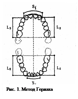 Исследование формы размеров и взаимоотношение зубов, зубных рядов и прикуса можно проводить в полости рта, но это сопряжено с рядом неудобств и неточностей. Поэтому эти исследования проводят на моделях челюстей. После изготовления моделей необходимо указать: фамилию, имя, отчество пациента, возраст, дату и номер истории болезни (такие модели называют диагностическими, они же являются и контрольными). На моделях верхней и нижней челюсти изучают особенности расположения зубов, форму и размеры зубных рядов и небного свода, развитие альвеолярных отростков соответственно трем взаимно-перпендикулярным плоскостям: срединно-сагиттальной, трансверзальной и вертикальной (окклюзионной). Сагиттальные исследования (по Герлах). Lr = Ll (+/- 3%). Где L - латеральный сегмент зубного ряда состоящий из суммы поперечных размеров клыка, обоих премоляров и первого моляра (r - правый, l –левый), а также установил связь в нормальном прикусе между величиной переднего и латерального сегментов (рис. 1). Идеальное соотношение при резцовом перекрытии на 1/3 высоты коронок (3мм), когда величина переднего сегмента Σ I – сумма поперечных размеров резцов – равна длине латерального сегмента: Σ I = L (+/- 3%).