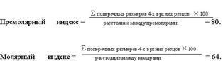 Для определения нормальной ширины зубного ряда в области первых премоляров – используется премолярный индекс, а в области первых моляров – молярный индекс.