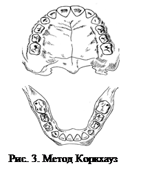 Если отсутствуют резцы верхней челюсти метод исследования проводится в модификации предложенной Тонн - используется сумма поперечных размеров 4-х нижних резцов, учитывая пропорциональность: сумма поперечных размеров четырех резцов верхней челюсти так относится к сумме поперечных размеров четырех резцов нижней челюсти как 4: 3. Исследование моделей челюстей в период сменного прикуса. Для исследования моделей в период сменного прикуса следует пользоваться методом Пона в модификации (по Коркхауз) (рис. 3). Вместо измерительных точек на премолярах верхней челюсти берутся точки в дистальных ямках жевательной поверхности первых временных моляров и дистально - щечные бугры первых временных моляров на нижней челюсти. Исследование моделей челюстей в период временного прикуса. При проведении исследования моделей челюстей в период временного прикусанеобходимо учитывать, что верхний и нижний зубной ряд в норме имеет форму полукруга, радиусом которого является перпендикуляр, опущенный из дистальной ямки жевательной поверхности второго моляра к срединно - небному шву (по Шварц).