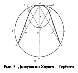 В ортодонтической практике наибольшее применение получила диаграмма Хаулея – Гербера – Гербста, которая основана на антропометрической зависимости величины и формы верхнего зубного ряда от поперечных размеров трех постоянных зубов - центрального и бокового резцов и клыка. Для изображения диаграммы определяется сумма поперечных размеров 11, 12, 13 зубов, величина которой берется за радиус АВ и очерчивается окружность из точки В(рис. 5). Радиусом АВ из точки А с обеих сторон откладываются точки С и D, образовавшаяся дуга CAD представляет собой кривую, характеризующую расположение и величину передней группы зубов от клыка до клыка. Для определения расположения боковых зубов и величины боковых участков зубного ряда необходимо сделать дополнительные построения. Из точки Е проводятся прямые через точки С и D и касательную к точке А, в результате образуется равносторонний треугольник EFG. Сторона полученного треугольника накладывается на диаметр АЕ и получается точка О, берется АО за радиус и очерчивается большая окружность. Отмечается точка М и радиусом ОМ откладываются точки H и J. Хаулей соединял точки С и Н; D и J и получал кривую HCADJ, утверждая, что эта кривая отражает нормальную форму верхнего зубного ряда. В действительности боковые зубы располагаются не по прямой линии, а по дуге, следовательно, такая кривая в виде параболы не отражает форму нормального зубного ряда. Гербст модифицировал диаграмму Хаулея, заменив боковые прямые линии дугами CN и DP, центрами которых являются точки L и K, лежащие на пересечении большой окружности с диаметром перпендикулярным АМ. Дуга CN описывается радиусом LC, а DP - радиусом KD. Таким образом, дуга NCADP имеет закругленные боковые участки и является полуэллипсом, что соответствует нормальной форме верхнего зубного ряда.