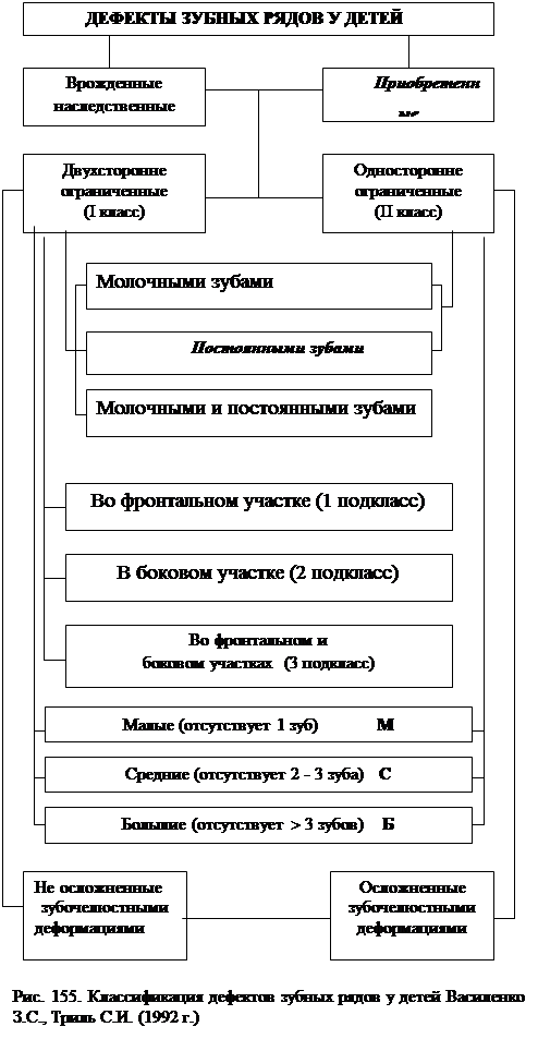 Нуждаемость в ортопедическом лечении детей в г. Харькове (по данным кафедры стоматологии детского возраста Харьковского государственного медицинского университета): 1. Дети с временным прикусом в 29,1% случаев нуждаются в протезировании зубов и зубных рядов. 2. В возрасте от 7 до 14 лет нуждается в протезировании 34,1% детей. 3. В возрасте от 15 до 17 лет нуждается в протезировании 37,1% детей, из них около 2,1% - съемными конструкциями зубных протезов. Процентное выражение нуждаемости детей г. Харькова в ортопедическом лечении превышает средние республиканские данные по всем возрастным группам. При проведениии обследования и определения распространенности дефектов зубных рядов для удобства регистрации, систематизации и статистической обработки полученных результатов, Самсоновым А.В. предложена специальная карта обследования. Она отражает необходимые параметры позволяющие определить достоверные значения процента распространенности дефектов зубных рядов у детей, их характер и нуждаемость в своевременном и рациональном протезировании. Для определения видов дефектов зубных рядов у детей предложено ряд классификаций, отражающих вид прикуса ребенка в зависимости от возраста (временный, сменный, и постоянный), его протяженность в зависимости от количества отсутствующих зубов и степени нарушения функции. Классификация предложенная Василенко З. С., Триль С. И. (1992). Демнер Л. М. и Лепехин В. П. (1985) предложили классификацию дефектов зубных рядов, обусловленных ранним удалением зубов во временном, сменном и постоянном прикусе, в которой выделены три группы с учетом топографии, протяженности дефекта и функциональных нарушений. Каждая группа имеет два подкласса. Первая группа -включенные дефекты зубного ряда, образовавшиеся вследствие преждевременного удаления одного временного зуба: 1. На одной стороне челюсти (односторонний). 2. На обеих сторонах челюсти (двусторонний). Вторая группа – включенные дефекты зубного ряда, при котором отсутствуют два рядом расположенных временных зуба: 1. На одной стороне челюсти (односторонний). 2. На обеих сторонах челюсти (двусторонний). Третья группа – дефекты зубного ряда, когда отсутствуютдва илиболее, рядом стоящих зуба: 1. На одной стороне челюсти (односторонний). 2. На обеих сторонах челюсти (дусторонний).