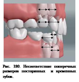 При прорезывании каждого такого резца происходит рассасывание корней двух рядом расположенных молочных зубов. В связи с этим наблюдается недостаток места для последовательно прорезывающихся резцов, а затем клыков. При ортодонтических показаниях к удалению отдельных зубов на правой и левой половинах челюстей желательно удалять их одновременно или с интервалом до 1 мес во избежание смещения средней линии между резцами. После удаления отдельных зубов показан массаж в области альвеолярного отростка, что ускоряет прорезывание постоянных зубов. Данная методика позволит использовать освободившееся место для правильного установления тесно расположенных зубов. В результате последовательного удаления временных, а затем постоянных зубов улучшается расположение зубов и соотношение зубных рядов. Оставшиеся незначительные промежутки в области удаленных зубов самоустраняются после прорезывания вторых и третьих постоянных моляров. Когда отдельные зубы удаляют несвоевременно и нарушают последовательность удаления отдельных зубов, остаются тремы между зубами. Удаление зубов в начальный период сменного прикуса позволяет разместить зубы в зубном ряду в более короткие сроки, уменьшить продолжительность пользования ортодонтическими аппаратами, достигнуть исправления положения зубов, не травмируя периодонтальные ткани, и при соответствующих показаниях может быть рекомендовано для ортодонтической практики. Удаление первых временных моляров вместе с зачатками первых премоляров. При неправильном расположении резцов, в основном боковых, места для которых в зубном ряду резко недостаточно или оно отсутствует, при значительном сужении апикального базиса, узком лице и наличии широких коронок резцов можно по показаниям удалить временные моляры одновременно с зачатками первых премоляров. Опыт клинической практики и научных исследований при применении такого способа комплексного лечения аномалий прикуса был обобщен В.П. Норкунайте, 1990 г. По данным автора у пациентов, у которых были удалены отдельные зубы по ортодонтическим показаниям, наблюдалась макродентия: при нормальном смыкании боковых зубов. Дефицит места в области боковых сегментов зубных рядов, называемых "опорными зонами", возникал в результате макродентии резцов, несоответствия размеров коронок временных и постоянных зубов и мезиального смещения боковых зубов. Сумма ширины коронок временных клыков, первых и вторых временных моляров на верхней челюсти была гораздо меньше суммы ширины коронок зачатков замещающих их постоянных клыков, первого и второго премоляров превышала названную сумму. Следовательно, был выявлен дефицит места для правильного установления в зубные ряды постоянных зубов, то же было и на нижней челюсти (рис. 180).