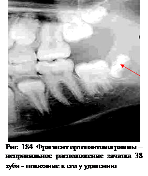 Удаление третьего моляра проводят по ортодонтическим показаниям редко. При зубочелюстных аномалиях важно определить величину зачатков этих зубов, их расположение, адентию отдельных третьих моляров. Формирование зачатков этих зубов начинается с 6-8 лет. Их отсутствие, обнаруженное при рентгенологическом обследовании после 14 лет, свидетельствует об адентии. Известно, что при прорезывании третьих моляров усиливается тесное расположение передних зубов, активируется рост челюстей.