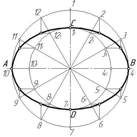 Кривая, заданная множеством точек, представляющая ряд сопряженных отрезков кривых, которые невозможно построить с помощью циркуля, называется лекальной кривой. Лекальные кривые – эллипс, парабола, гипербола, синусоида, спираль Архимеда, эвольвента, циклоидальные кривые и многие другие имеют широкое применение в технике, так, например, профили зубьев цилиндрических, конических и винтовых зубчатых колес очерчивают или по эвольвенте окружности, или другим циклоидальным кривым. Особенно широко применяются в технике кривые второго порядка, к ним относятся конические сечения: окружность, эллипс, парабола и гипербола. Эти кривые являются образующими ряда поверхностей вращения (например, эллипсоида, параболоида), часто встречающихся в различных инженерных конструкциях. Поэтому необходимо изучить законы образования лекальных кривых и освоить приемы их построения. Эллипс – замкнутая кривая, для которой сумма расстояний от любой ее точки до двух точек ‑ фокусов эллипса, ‑ величина постоянная, равна большой оси эллипса.