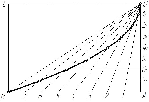 Существует множество способов построения эллипса, основанных на его свойствах, рассмотрим наиболее простой – построение эллипса по большой АВ и малой CD осям (рис. 2.15). Проводим осевые линии, затем от центра О откладываем вверх и вниз по вертикальной оси отрезки ОC и ОD, равные длине малой полуоси, а влево и вправо по горизонтальной оси отрезки ОА и ОВ, равные длине большой полуоси. Из центра О радиусами ОА и ОC проводим две концентрические окружности и ряд лучей-диаметров. Из точек пересечения лучей с окружностями проводим линии, параллельные осям эллипса, до взаимного пересечения в точках, образующих эллипс. Намеченную точками линию строим по лекалу. Парабола – плоская кривая, каждая точка которой равноудалена от точки (фокуса), лежащей на оси симметрии и прямой (направляющей, директрисы), перпендикулярной оси симметрии. Известно несколько способов построения параболы, рассмотрим способ построения по заданной вершине О, оси ОС и точке В (рис. 2.16).