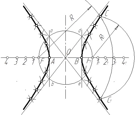 Строим вспомогательный прямоугольник ABCD. Стороны AB и АО делим на равные части и точки деления нумеруем. Горизонтальный ряд деления (на АВ) соединяем лучами с вершиной О, а через точки деления расположенные на АО, проводим линии, параллельные оси параболы. Точки пересечения горизонтальных прямых 11, 21,… с лучами О1, О2,… принадлежат параболе. Полученные точки параболы соединяем по лекалу. Гипербола – плоская кривая, состоящая из двух разомкнутых, симметрично расположенных ветвей (рис. 2.17) разность расстояний от каждой точки гиперболы до фокусов F и F1 есть величина постоянная и равная расстоянию между вершинами А и В. Рассмотрим способ построения гиперболы по заданному расстоянию между вершинами АВ и фокусному расстоянию FF1. Проводим осевые линии, затем от центра О, разделив расстояние между вершинами АВ и фокусное расстояние FF1 пополам, откладываем влево и вправо по горизонтальной оси отрезки ОА и ОВ и отрезки ОF и ОF1. Слева от фокуса F произвольно берем ряд точек 1, 2, 3, 4,…, постепенно увеличивая расстояние между ними. Из фокуса F описываем дугу вспомогательным радиусом R, равным, например, расстоянию от вершины В до точки 3. Из фокуса F1 проводим вторую вспомогательную дугу радиусом R1, равным расстоянию от вершины А до точки 3. На пересечении этих дуг находим точки С и С1, принадлежащие гиперболе. Аналогично строим остальные точки правой ветви гиперболы. Левую ветвь гиперболы строим аналогично.