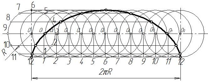 Построение циклоиды. На направляющей горизонтальной прямой (рис. 2.21) откладываем длину производящей окружности радиусом R, равную 2πR. Окружность и отрезок делят на несколько равных частей, удобно на 12. Из точек делений отрезка 1, 2, 3, 4,…, 12 восстанавливаем перпендикуляры до пересечения с продолжением горизонтальной оси окружности, получаем точки О1, О2,..., О12. Из точек делений окружности проводим горизонтальные прямые, на которых из точек Оt, О2,..., О12 делаем засечки дугами окружности радиуса R и получаем точкипринадлежащие циклоиде, которые соединяем по лекалу плавной кривой линией. Эпициклоида ‑ это плоская кривая линия, являющаяся траекторией точки, лежащей на окружности, которая катится без скольжения по направляющей окружности.