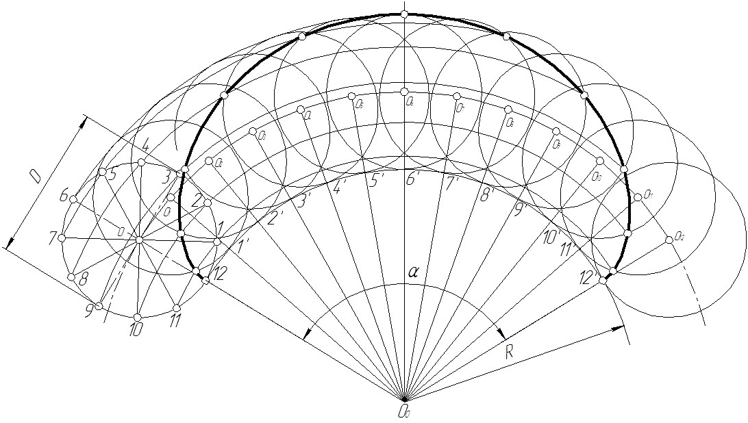 Построение эпициклоиды. Производящую окружность диаметра D и направляющую окружность радиуса R проводим так, чтобы они касались в точке 12 (рис. 2.22). Производящую окружность делим на 12 равных частей. Из центра О0 радиусом, равным R + 0,5D, проводим вспомогательную дугу. Центральный угол α определяют по формуле α = Разделив дугу направляющей окружности, ограниченную углом Из точек О1, О2, О3,..., О12, как из центров, проводим окружности диаметром D до пересечения с вспомогательными дугами и получаем точки пересечения, принадлежащие эпициклоиде. Полученные точки соединяем по лекалу.