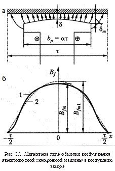 Синхронных машин Магнитное поле и параметры Обмотка возбуждения создает магнитный поток возбуждения синхронной машины, который сцепляется с обмоткой статора и индуктирует в ней ЭДС. Явнополюсная машина. На рис. 2.1 изображена картина магнитного поля обмотки возбуждения в воздушном зазоре явнополюсной синхронной машины на протяжении одного полюсного деления. Вполне синусоидального распределения индукции достичь не удается и поле возбуждения (кривая 1 на рис. 2.1) можно разложить на основную (кривая 2) и высшие гармоники, которые индуктируют в обмотке статора основную и высшие гармоники ЭДС.