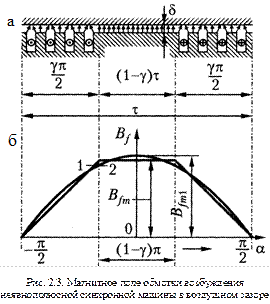 в соответствии с (2.1) называется коэффициентом формы поля возбуждения, который определяет отношение амплитуды индукции основной волны поля возбуждения к действительному максимальному значению индукции поля возбуждения. Наименьшее относительное содержание гармонических получается при Обмотку возбуждения неявнополюсной машины можно также рассматривать как распределенную однофазную обмотку с полным шагом. Коэффициент распределения или обмоточный коэффициент этой обмотки