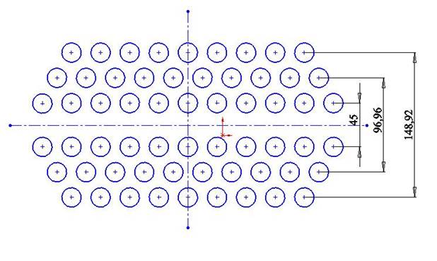 Побудова трубних решіток. Вихідні дані: Кількість отворів = 58, діаметр отвору під трубку=20мм, ширина канавки для перегородки=5мм, глубина=5мм Відстань між центрами отворів=3*радиус отвора =30мм. Побудову ескіза починаємо з формування масиву кіл.