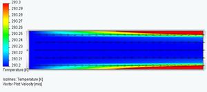 Це допустима величина для моделювання процесів газогідродинаміки, оскільки ми моделювали з точністю (level=3) для скорочення часу обчислень на комп”ютері низької продуктивності. Продовжимо аналіз результатів експерименту розглядаючи розподіл температури потоку.