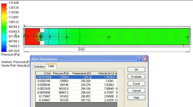 Рис.11 Розподіл тиску і таблиця вимірюваних (в 7-ми точках) параметрів. Будуємо графіки швидкості і тиску