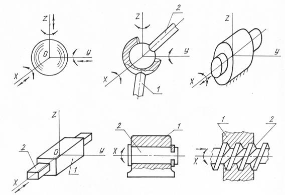 Рис. 1.1 Основными признаками механизма являются подвижность звеньев и определенность в преобразовании их движений. Подвижные звенья входят в соединение между собой или с неподвижным звеном так, что имеется возможность движения одного звена относительно другого. Соединение двух соприкасающихся звеньев, допускающее их относительное движение, называется кинематической парой. Поверхности, линии, точки, по которым одно звено соприкасается с другим, образуя кинематическую пару, называют элементами пары. Кинематические пары накладывают на относительные движения звеньев ограничения, зависящие от способа соединения звеньев пары. Известно, что всякое свободное твердое тело имеет 6 степеней свободы, которые можно представить в виде простейших движений: три вращения вокруг координатных осей и три поступательных перемещения вдоль этих осей (рис. 1.2, а). Присоединением звеньев механизма друг к другу ограничиваются некоторые из указанных движений. Ограничения, накладываемые на относительные движения звеньев, входящих в кинематическую пару, называются условиями связи в кинематических парах. Очевидно, что число ограничений может быть только целым и должно быть меньше шести, так как в противном случае звенья теряют относительную подвижность и кинематическая пара переходит в неподвижное соединение звеньев. Число условий связи не может быть меньше единицы, ибо в этом случае звенья не соприкасаются и кинематическая пара перестает существовать. Для удобства анализа структуры механизмов кинематические пары классифицируют по различным признакам. В зависимости от числа отнятых кинематической парой независимых возможных перемещений звеньев, т.е. от числа отнятых степеней свободы, пары делятся на пять классов; порядок класса соответствует числу ограничений движения. На рис. 1.2, б, в показаны соответственно пары 3-го и 4-го классов, а на рис. 1.2, г, д, е изображены пары 5-го класса (поступательная, вращательная, винтовая). Кинематические пары 5-го класса имеют наибольшее распространение, поскольку они являются основой направляющих поступательного и вращательного движений. По характеру относительного движения звеньев кинематические пары делят на плоские и пространственные. Точки звеньев, входящих в плоские пары, могут двигаться в одной или параллельных плоскостях. К плоским кинематическим парам относятся пары только 5-го и 4-го классов, так как свободное тело, совершающее плоское движение, имеет только три степени свободы, три возможные простейшие движения: два поступательных вдоль координатных осей плоскости и вращательное – в плоскости движения. Точки звеньев пространственных пар при движении описывают пространственные кривые.
