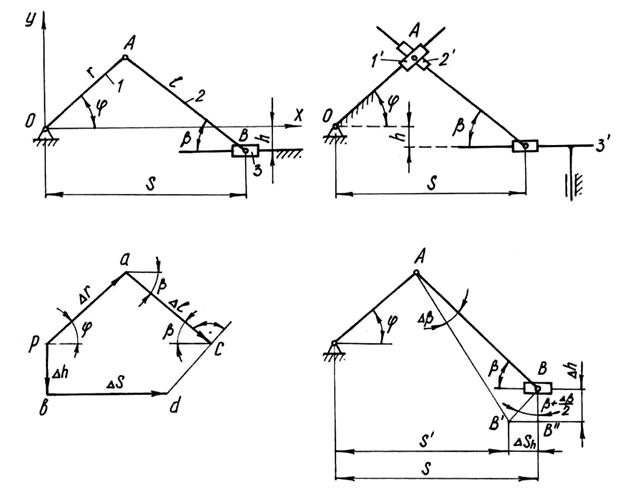 Данный метод позволяет определить погрешность механизма из геометрических построений на основании сопоставления двух механизмов: теоретического и с первичной ошибкой. При установлении зависимостей между величиной первичной ошибки и ошибкой положения механизма пользуются упрощениями, которые снижают точность метода, например, при малых углах (Δβ): sin (β + Δβ) ≈ sin β; tg (β + Δβ) ≈ tg β; cos Δβ ≈ 1, длины дуги и хорды равны и т.д. Пример. Определим ошибку положения ΔS кривошипно-ползунного механизма (рис. 4.13, а), содержащего первичную ошибку Δh. На рис. 4.13, г построен план действительного механизма, содержащего только первичную ошибку Δh эксцентриситета h. Так как размеры других звеньев приняты без ошибок, то точка В из-за ошибки Δh должна переместиться в положение В′. Зависимость между первичной ошибкой Δh и частной погрешностью ΔSh найдем из треугольника BB′B′′: Принимаем