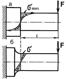 Рис. 5.26 Количественной мерой концентрации напряжений служит коэффициент концентрации. Различают теоретический и эффективный коэффициенты концентрации напряжений. Теоретический коэффициент концентрации αK равен отношению наибольшего местного напряжения σmax в сечении к расчетному напряжению σ в этом сечении, т.е. αK = σmax/σ. Наибольшие напряжения σmax в местах концентрации определяют экспериментально или рассчитывают с помощью методов теории упругости. Величина теоретического коэффициента концентрации зависит от вида и размера концентратора и может достигать трех и более. При определении αK не учитывают влияние свойств материала, в частности чувствительность материала к наличию концентраторов. Величина αK определена для большинства встречающихся типовых конструктивных элементов, значения αK приводятся в справочной литературе в виде таблиц и графиков. Концентрация напряжений различно влияет на прочность конструктивных элементов в зависимости от свойств материала и от характера нагружения. Это учитывается с помощью эффективного коэффициента концентрации Кσ. При статическом нагружении величина Кσ определяется как отношение предела прочности σu образцов без концентраторов к пределу прочности σuк образцов, имеющих заданный концентратор, т.е. Кσ = σu/σuк. Для пластичных материалов при статических нагрузках концентрация напряжений практически не влияет на прочность. Несущая способность конструкции сохраняется благодаря местной пластической деформации без образования трещин в зоне повышенных напряжений. Можно считать для пластичных материалов Кσ = 1 и не учитывать концентрацию напряжений при статическом нагружении. Для хрупких материалов величина Кσ приближается к значению теоретического коэффициента концентрации αК. Детали из хрупких материалов при наличии концентрации напряжений рассчитывают на прочность по пониженным допускаемым напряжениям σadm. Снижение σadm можно считать как увеличение коэффициента запаса прочности n в Кσ раз (σadm = σu /n). Концентрация напряжений обязательно должна учитываться в расчетах на прочность при действии переменных нагрузок (подразд. 5.17). Для уменьшения концентрации напряжений необходимо: применять плавные переходы, называемые галтелями при резком изменении размеров поперечного сечения (рис. 5.27, б); прорези заменять полукруглыми выточками; увеличивать радиусы закруглений галтелей и выточек; круглые отверстия заменять эллиптическими, вытянутыми вдоль оси стержня; необходимые отверстия располагать в зоне пониженных напряжений и т.д.