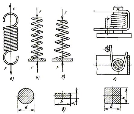 Наиболее широко из упругих элементов в приборо- и машиностроении используются винтовые пружины. Она просты и компактны по конструкции, надежны в работе. Их изготавливают путем холодной и горячей навивки проволоки с круглым, квадратным или прямоугольным поперечным сечением на специальные оправки. По форме оправки винтовые пружины делятся на цилиндрические, конические и параболоидные, по виду нагружения – на пружины растяжения (рис. 10.3, а), сжатия (рис. 10.3, б, в) и кручения (рис. 10.3, г). Основными размерами винтовых пружин являются: диаметр проволоки d; наружный диаметр D; средний диаметр витка пружины Dср; шаг витков t; число витков i; длина пружины в свободном (ненагруженном) состоянии Н (для пружин сжатия и растяжения); индекс пружины c = Dср / d.