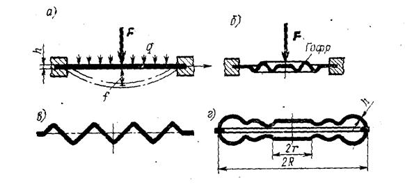 Мембраной называют тонкую упругую, чаще всего круглую, плоскую или гофрированную пластину, закрепленную по краям. Она бывает металлической или неметаллической (рис. 10.9). Мембраны применяют в качестве упругих элементов в муфтах, чувствительных элементов систем для измерения давления, в микрофонах, телефонах, тормозных устройствах. Под действием газа, жидкости или сосредоточенной силы (рис. 10.9, а) мембрана прогибается и в ней возникают деформации изгиба и растяжения. Для уменьшения растягивающих напряжений мембраны выполняют гофрированными. Плоские мембраны имеют большую жесткость и очень малый прогиб. В гофрированных мембранах концентричные волнообразные складки (гофры) могут быть выполнены различного профиля (рис. 10.9, б, в)–синусоидального, пилообразного, трапецеидального. Эти мембраны отличаются большей надежностью и чувствительностью, их конструкция допускает значительные деформации. Упругая характеристика гофрированной мембраны может быть линейной, затухающей и возрастающей, ее получают путем подбора формы, глубины и числа гофр, материала, толщины и диаметра мембраны. Две гофрированные мембраны, сваренные или спаянные по буртику, образуют мембранную коробку (рис. 10.9, г), которая позволяет увеличить чувствительность упругого элемента. Мембранные коробки по использованию делят на манометрические, анероидные и наполненные. Внутренняя полость манометрических коробок соединена со средой, давление которой (избыточное или вакуум) необходимо измерить. В анероидных коробках из внутренней полости откачивают воздух до разрежения 0,1…0,2 МПа. Они измеряют абсолютное давление воздуха в барометрах и высотомерах. В наполненной мембранной коробке внутренняя полость заполнена азотом или парами эфира. Такие коробки применяют в термометрах и терморегуляторах.
