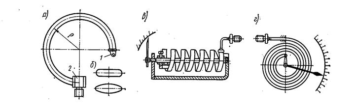 Металлические мембраны изготавливают из нержавеющих сталей, фосфористой и бериллиевой бронз, биметаллов, неметаллические – из резины, кожи, пластмасс, прорезиненного шелка. Толщина металлических мембран составляет 0,06 … 1,5 мм, а неметаллических – 0,1 … 3 мм. Неметаллические мембраны менее долговечны, их свойства сильно зависят от температуры и времени эксплуатации (старение свойств). Сильфонами называются тонкостенные цилиндрические сосуды, стенки которых имеют волнообразные складки (гофры) (рис. 10.10). Они применяются для измерения давления, герметизации подвижных соединений, в качестве сосудов переменной емкости (рис. 10.10, а), упругих соединений трубопроводов (рис. 10.10, б). Под действием сил F, приложенных к крайним сечениям внутреннего или внешнего давления, стенки сильфона деформируются и изменяется его длина. Конструкции, основные параметры и размеры сильфонов определяются ГОСТами. По сравнению с мембраной сильфоны имеют большие габариты и более сложны в изготовлении. Их диаметр равен 8 … 150 мм и толщина стенок– 0,1 … 0,5 мм. Сильфоны изготавливаются цельнотянутыми или паяными из латуни Л80, бериллиевых бронз БрБ2, БрБ2,5, нержавеющей стали Х18Н10Т и других материалов. Трубчатые пружины применяют для измерения избыточного давления или вакуума. Манометрическая пружина Бурдона представляет собой изогнутую по дуге окружности полую трубку (рис. 10.11,а) эллиптического или овального сечения (рис. 10.11, б). Свободный конец 1 трубки запаян и связан с передаточным механизмом, а другой конец 2 соединен с измеряемой средой. Под действием давления или разрежения трубка меняет свою кривизну, свободный конец трубки перемещается пропорционально величине давления.