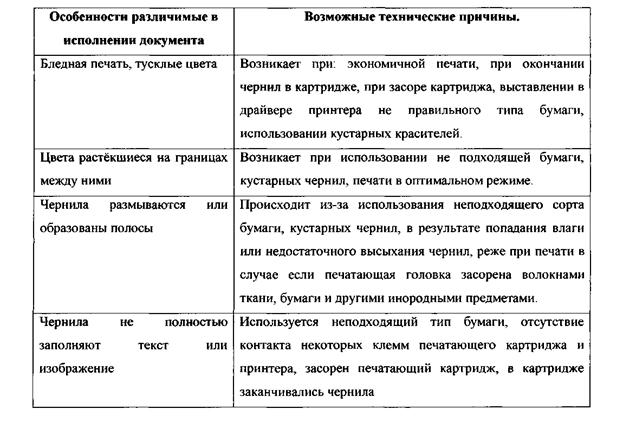 3) струйные или капельные (самый распространённый на сегодняшний день тип принтеров, как в нашей стране, так и за рубежом, обычно имеют два печатающих картриджа: чёрный и цветной. Ранние модели струйных принтеров были так же с одним картриджем, и поддерживали либо только монохромную печать, либо цветную печать при ручной замене чёрного картриджа на цветной. Этот тип принтеров распространён, прежде всего, благодаря высокому качеству печати, относительной дешевизне самих печатающих устройств, простоте обслуживания и эксплуатации; 4) лазерные (в настоящее время получает всё большее распространение, является одним из самых перспективных типов принтеров). Наибольшее распространение получает монохромный вариант этого типа печатающего устройства, в первую очередь благодаря высоким эксплуатационным качествам и крайне низкой стоимости расходных материалов. При этом благодаря использованию в качестве расходного материала полимерного тонера, документы такого типа не боятся влаги и других вредных воздействий окружающей среды. При этом качество документов является очень высоким и часто выше полиграфического. Цветные модели данных устройств, пока не получают большого распространения из-за очень высокой стоимости, как самих устройств, так и расходного материала. При хорошем исполнении отличить настоящие документы от поддельных, выполненных на принтерах такого типа практически невозможно, если оригиналы не имели специальных видов защиты от подделки. Основные признаки исполнения документов на современных печатающих устройствах. Наиболее часто для изготовления фальшивых документов используются цветные струйные и лазерные монохромные принтеры. Для их изготовления злоумышленниками обычно используются устройства ввода изображения оригинала документа, - сканеры. С помощью аппаратно-программного комплекса сканер - компьютер - программное обеспечение для работы с текстом и графикой - цветной струйный принтер, даже не очень подготовленный человек в состоянии сделать копии кассовых чеков, подписей, печатей и штампов, различных удостоверений, не говоря уже о различных операционных бумагах, таких как бланки рецептов, счета, бланки различных управленческих бумах. Качество исполнения зависит не только от возможностей оборудования, но и от навыков и умений лица осуществляющих подделку перечисленных выше предметов. Основными признаками грубой подделки документов с использованием компьютерной техники являются: 1) нарушение цветовой гамы изображения, что в первую очередь связано либо с дефектами чернил принтера, либо с нарушением гаммы изображения при сканировании оригинала. Последнее происходит довольно часто, так как практически крайне сложно произвести точный подбор гаммы даже специалисту; 2) как следствие, нарушения цветовой гаммы печать элементов, которые должны быть напечатаны черным цветом, с помощью смешения основных цветов гаммы, что обычно сразу же видно при осмотре документа невооружённым глазом. Это связано с тем, что цветогенерация практически во всех струйных принтеров производится путем визуального смешения цветных точек друг другом, и от количества микроточек определенного цвета на печатной площади документа. Обычно при цветогенерации используются три основных цвета: ярко-жёлтый, ярко-голубой и бордово-