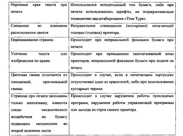 Криминалистическое значение отдельных неисправностей для идентификации аппаратно-программного комплекса: 1. Использование кустарных чернил ведёт к ухудшению качества печати в следствие износа печатающих головок, засора сопел печатающей головки. Кустарная заправка картриджей запрещена практически всеми производителями печатающих устройств, однако повсеместно практикуется в нашей стране. Так как в среднем стоимость одного печатающего картриджа составляет до 1/5 стоимости принтера, стоимость же заправки одноцветного картриджа в 7-14 раз ниже стоимости картриджа. Конструктивные особенности картриджей, используемые для кустарной заправки, позволяют довольно быстро, в домашних условиях, производить заправку практически любыми чернилами, в том числе чернилами, имеющими любой состав и вязкость при умелом использовании без ущерба для материальной части печатающей головке. Так, например, при подделке печатей и штампов могут использоваться канцелярские чернила, что делает практически невозможным даже определение компьютерного происхождения документа. Однако их использование позволяет при сложном комплексном исследовании определить и сопоставить с изъятыми образцами химический состав чернил, так как кустарные чернила достаточно разнородны, имеют различную вязкость, яркость и состав; 2. Наличие усечения изображения позволят определить границы 3. При постоянной печати засоры картриджа являются важным признаком, указывающим на использовании определённой печатающей головки. Засоры определённых сопел довольно устойчивы и появляются (часто) либо исчезают (крайне редко) при кустарной заправке картриджа, использовании кустарных чернил. Они являются единственными признаками, позволяющими индивидуализировать струйное печатающее устройство; 4. Особенности цветовой гаммы, шрифтов являются свидетельством на того, какое при исполнении документа использовалось программное обеспечение для обработки текста и изображений, каким образом изображение создавалось, оцифровалось и т. д.; 5. Наличие пустых областей, полос в местах, где изображение или текст должны были присутствовать связанное с отсутствием контакта в клеммах принтера и печатающей головки картриджа (при повреждении первых) иногда является постоянным признаком печати конкретного принтера вне зависимости от типа изображения и смены картриджа, что является важным признаком при проведении экспертизы документа и аппаратного комплекса. Дифференциация лазерных принтеров по изготовленным на них документам. ГУ Пензенская ЛСЭ представлены результаты экспериментальных исследований документов изготовленных на лазерных принтерах различных марок. Проведен анализ признаков печатающих устройств с точки зрения их значимости для дифференциации лазерных принтеров по моделям и фирмам производителям. Нередко при решении вопроса: «На данном ли оборудовании (компьютер и лазерный принтер) выполнен представленный документ?» - эксперт вынужден давать вывод о невозможности ответа на него. Такая ситуация возникает в случаях, когда на исследуемом документе либо на документах-образцах, напечатанных на исследуемом лазерном принтере, не имеется каких-либо существенных дефектов печати. В настоящее время в экспертной практике отсутствуют методические рекомендации или источни