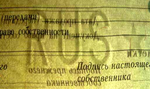 Вид паспорта транспортного средства, сфотографированного на просвет (проходящий свет), на котором виден водяной знак в виде текста «RUS».