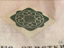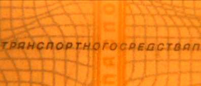 Вид особой отметки на паспорте транспортного средства, сфотографированной в двух разных положениях, в каждом из которых ее цветовое восприятие меняется (осмотр в косопадающем свете). - методы визуального исследования, исследуя микроизображения применяя увеличительные технические средства