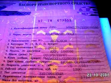 Вид паспорта транспортного средства, сфотографированного при ультрафиолетовом свечении, на котором просматривается текст «Россия» (в зависимости от года выпуска ПТС текст может быть иным «ГИБДД» и т.д.).