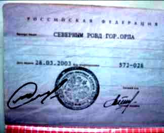 Докладываю, что I0.08.20011 года в 19-45 при следовании совместно с рядовым полиции Ивановым И.И. по маршруту № 2 по улице Октябрьская города Орла около дома № 56 я увидел гражданина, внешность которого совпадала с признаками лица разыскиваемого поориентировке полученной мною во время инструктажа при разводе на службу. При проверке документов заподозренный предъявил паспорт серии 53 04 № 595896 выданный 18 июля 2002 года Заводским РОВД г. Орла Сидорову Семёну Семёновичу. При детальном рассмотрении паспорта было установлено, что в графе – "дата выдачи" около цифр"02" нарушена линия линовки, на пятой странице паспорта (внизу) красителем красного цвета указана серия паспорта "54 03" и номер "585896", а также цифры "896" выполнена красителем более темного цвета, чем цифры "585".