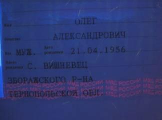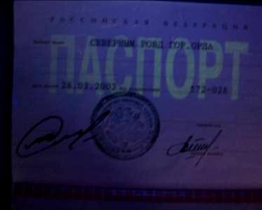 Вид страницы паспорта, сфотографированной при ультрафиолетовом свечении, на которой просматривается текст «ПАСПОРТ».