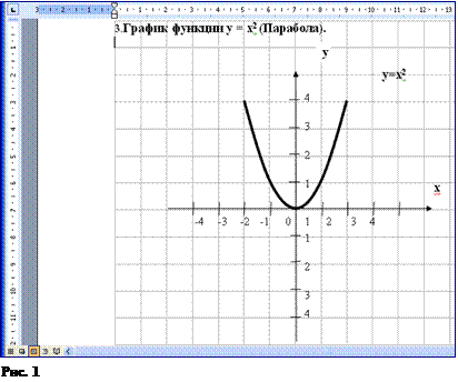 Задание 2. Нарисовать график функции у = х. Последовательность макрокоманд выполнения задания Все координаты, кроме координат привязки к листу рисунка декартовой системы координат, даны относительно нарисованной системы декартовых координат. 1. Установка текстового курсора. Параметры: - позиция: строка №27 (у=13 см). 2. Печать текста. Параметры: - текст: «2. График функции у = х» 3. Выделение объекта. Параметры: - объект: рисунок декартовой системы координат. 4. Копирование объекта. Параметры:- объект: рисунок декартовой системы координат. 5. Вставка объекта. Параметры:- объект: рисунок декартовой системы координат. 6. Перемещение объекта. Параметры:- объект: рисунок декартовой системы координат, - координата х: 7, - координата у:19. (Координаты центра декартовой системы уоординат относительно линеек листа) 7. Рисование прямой линии. Параметры:- координаты начала: (-4, -4), - координаты конца: (4, 4) (Координаты относительно рисунка декартовой системы координат) 8. Вставка надписи.Параметры: - координаты левого нижнего угла: (1, 3), - координаты верхнего правого угла: (3, 4), - текст: «y = x», - размер шрифта: 14 пт., - начертание: полужирный. 9. Установка цвета заливки. Параметры: - цвет: нет 10. Установка цвета линии. Параметры: - цвет: нет 11. Рисование прямой линии. Параметры: - координаты начала: (1, 0), координаты конца: (1, 1). 12. 13. Изменение ширины линии. Параметры:- объект: прямая линия у = х. 14. Группировка объектов. Параметры: - объекты: все элементыграфика функции у = х. 15. Сохранение документа. Параметры: - имя: графики функций. Задание 3. Нарисовать график функции у=х2. Программа выполнения задания Все координаты, кроме координат привязки к листу рисунка декартовой системы координат, даны относительно декартовых координат. 1. Установка текстового курсора. Параметры: - позиция: лист2 первая строка. 2. Печать текста. Параметры: - текст: «3. График функции у = х2 (Парабола).» 3. Выделение объекта. Параметры: - объект: рисунок декартовой системы координат (лист 1). 4. Копирование объекта. Параметры:- объект: рисунок декартовой системы координат. 5. Вставка объекта. Параметры: - объект: рисунок декартовой системы координат. 6. Перемещение объекта. Параметры: - объект: рисунок декартовой системы координат, координата х: 7лист 2, координата у: 6лист2. 7. Рисование прямой линии. Параметры:- координаты начала: (1, 0), - координаты конца: (1, 1). 8. Рисование прямой линии. Параметры: - координаты начала: (-1, 1), - координаты конца: (1, 1), 9. Рисование прямой линии. Параметры: - координаты начала: (-1, 0), - координаты конца: (-1, 1). 10. Рисование прямой линии. Параметры: - координаты начала: (2, 0), - координаты конца: (2, 4), 11. Рисование прямой линии. Параметры: - координаты начала: (2, 4), - координаты конца: (-2, 4). 12. Рисование прямой линии. Параметры: - координаты начала: (-2, 0), - координаты конца: (-2, 4), 13. Вставка надписи.Параметры: - координаты левого нижнего угла: (2, 4), - координаты верхнего правого угла: (4, 5), - текст: «у = х2», - размер шрифта: 14 пт, - начертание: полужирный. 14. Установка цвета заливки. Параметры: - цвет: нет 15. Установка цвета линии. Параметры: - цвет: нет 16. Рисование кривой линии. Параметры: - точки: (-2, 4), (-1, 1), (0,0), (1,1), (2,4). 17. 18. Группировка объектов. Параметры:- - объекты: все элементыграфика параболы. 19. Сохранение документа. Параметры: - имя: графики функций.