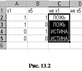 Система (1) представляет математическую модель искомой задачи. Один из способов решения (1) состоит в подборе тех единичных термов логических функций Для нахождения всех единичных термов системы (1) необходимо произвести вычисление таблиц функций f 1, f 2, f 3, f 4, f 5. Это можно сделать с помощью программы Microsoft Excel. Для этого: 1. Включите компьютер; 2. После того, как на экране монитора появится рабочий стол операционной системы Windows, откройте окно Microsoft Excel; 3. Заполните ячейки A1¸B4 таблицы, перебрав все варианты значений логических переменных х1 и х5; 4. Постройте таблицу истинности для функции f 1, воспользовавшись функциями НЕ, И, ИЛИ, которые находятся в мастере функций ƒх в категории ЛОГИЧЕСКИЕ. Для этого: активизируйте ячейку С2; воспользуйтесь функцией НЕ (см. рис. 13.1); автозаполнением занесите полученные результаты в ячейки С2¸С5 (рис. 13.2)