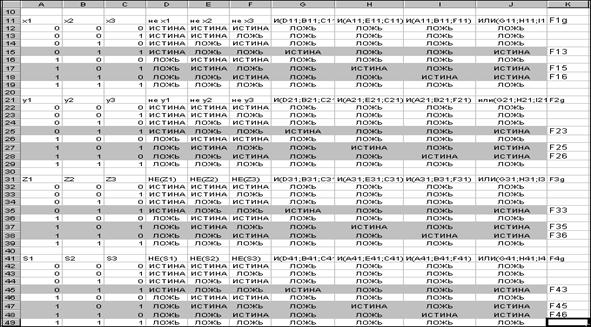 Поскольку в формулах (9) главной операцией считается операция конъюнкции, то единичные термы называют конъюнктивными термами. Если три конъюнктивных терма объединить знаком дизъюнкции, то согласно теории логических функций, получим аналитическое представление функции в форме СДНФ (8). Для получения явного вида конъюнктивных термов логических функций 7. В окне Microsoft Excel заполните ячейки А12¸С49 таблицы, перебрав все варианты значений логических переменных хj, уj, zj и sj; Постройте таблицу истинности для функций Fij, воспользовавшись функциями НЕ, И, ИЛИ, которые находятся в мастере функций ƒх в категории ЛОГИЧЕСКИЕ. См. пп. 4 – 5. В конечном итоге получаем таблицу, показанную на рис. 13.5. Из таблицы, изображённой на рис. 13.5, формируем таблицу 11, состоящую из конъюнктивных термов функций