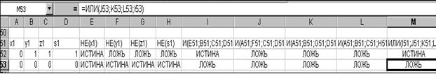 Теперь значения переменных из таблицы 13 подставим в правую часть формулы (11) и произведём вычисление f с помощью программы Microsoft Excel. Для этого: 8. В ячейках А52 – D52 запишите значения переменных x1, y1, z1 и s1 из таблицы 13. 9. Далее, с помощью функций НЕ, И, ИЛИ найдём значение функции f. В данном случае получим: f = f max=1. 10. Аналогично вычислим f по (11) с использованием значений переменных из таблицы 12; тогда будем иметь: f = f min=0 (рис. 13.6).